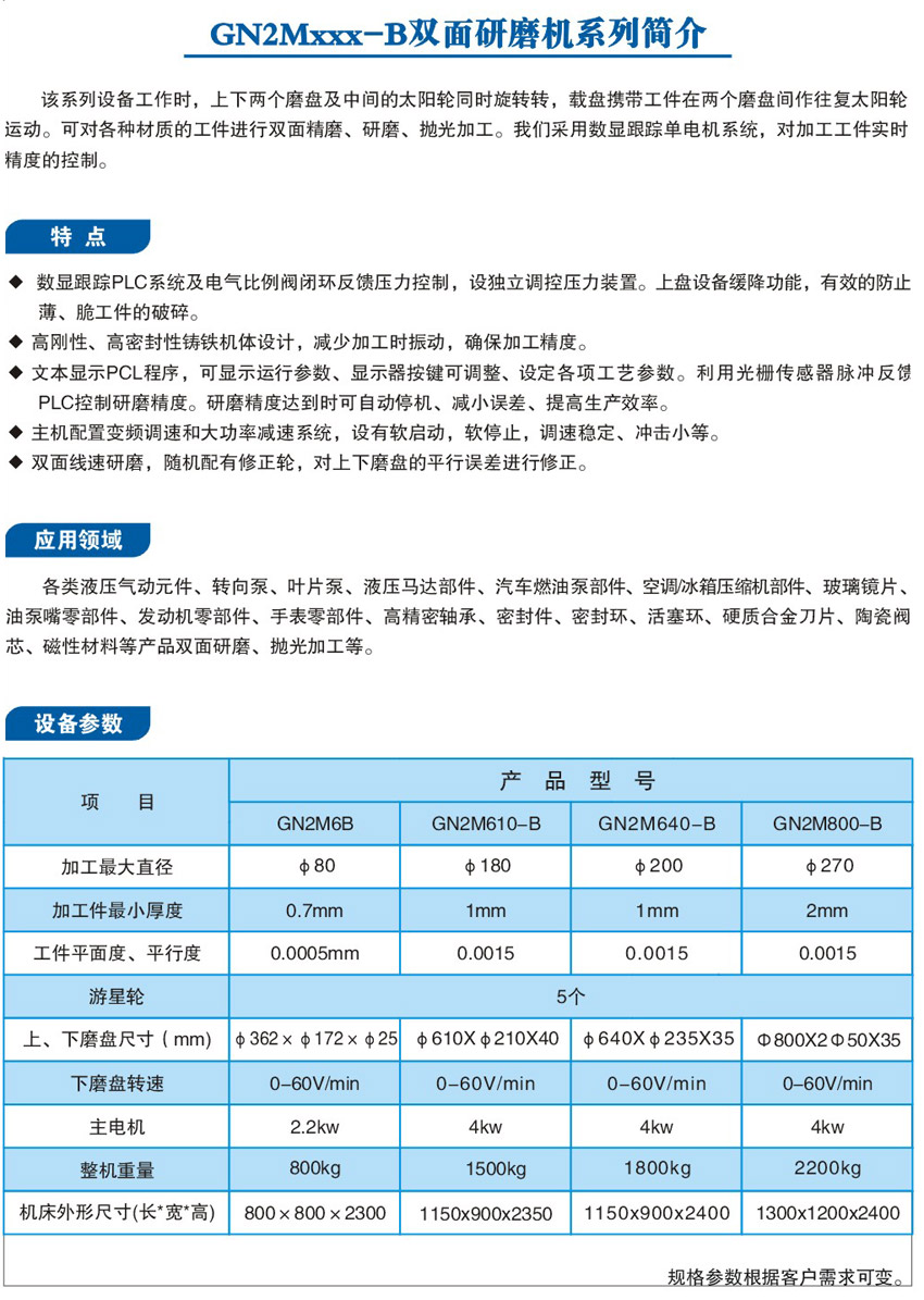 安徽格楠機(jī)械有限公司是專業(yè)生產(chǎn)雙面研磨機(jī)、數(shù)顯雙面研磨機(jī)、超聲波清洗機(jī)、研磨拋光機(jī)、平晶檢測(cè)儀、研磨床等產(chǎn)品的高科技企業(yè)。雙面研磨機(jī)是用涂上或嵌入磨料的研具對(duì)工件表面進(jìn)行研磨的磨床。雙面研磨機(jī)主要用于兩面平行的晶體或其它機(jī)械零件進(jìn)行雙面研磨,特別是薄脆性材料的加工。適用于各種材質(zhì)的機(jī)械密封環(huán)、陶瓷片、氣缸活塞環(huán)、油泵葉片軸承端面及硅、鍺、石英晶體、石墨、藍(lán)寶石、光學(xué)水晶、玻璃、鈮酸鋰、硬質(zhì)合金、銹鋼、粉灰冶金等金屬材料的平面研磨和拋光。雙面研磨機(jī)控制系統(tǒng)以PLC為控制核心,數(shù)字顯示器為人機(jī)對(duì)話界面的控制方式。人機(jī)對(duì)話界面可以就設(shè)備維護(hù)、運(yùn)行、故障等信息人對(duì)話;操作界面直觀方便、程序控制、操作簡(jiǎn)單,全方位安全考慮,非正常狀態(tài)的誤操作無(wú)效。
